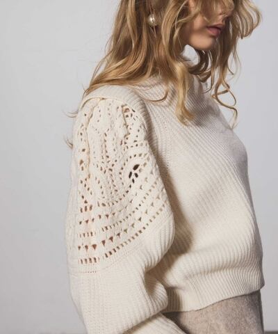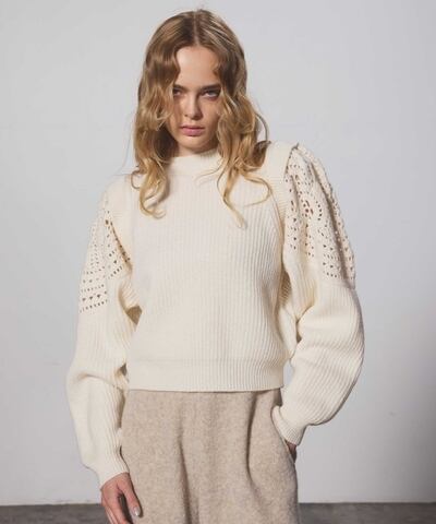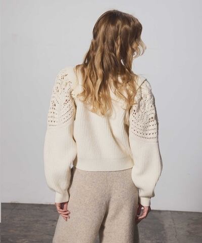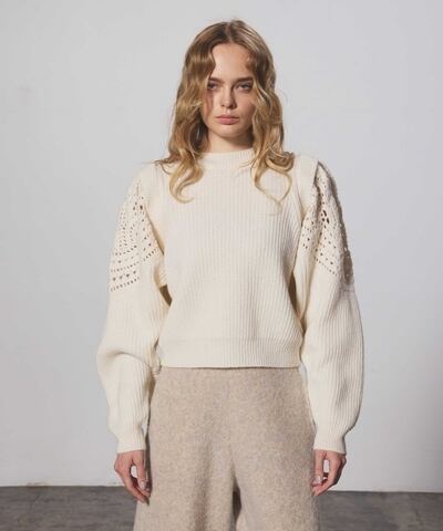 袖に豪華に入ったかぎ針風の編み地がキャッチーなニットトップスです。