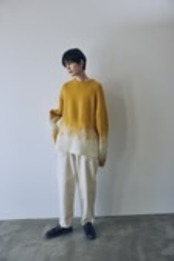 2種類の異なる糸をジャガード柄の配色で組み合わせたパッと目を引くニットはゆるいシルエットとあたたかさが冬の装いにマッチします。空の色の移りかわりを彷彿とさせるカラーリングにも注目。
