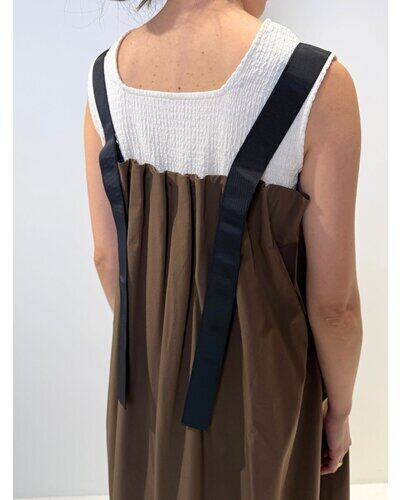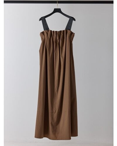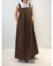 胸元に施したタックギャザーがデザインのポイントとなるキャミワンピース。素材感に表情のある生地を使用し、シンプルながらも存在感のある一着に仕上げました。切り替えを入れたすっきりとしたシルエットに、ポケット付きで実用性も兼備。肩紐には配色のブラックグログランテープを採用し、モードな印象をプラスしました。内側の3段階ホックで長さ調整ができ、長めの肩紐がバックスタイルのアクセントに。撥水加工と伸縮性のある素材で、デイリーから旅先まで幅広く活躍します。