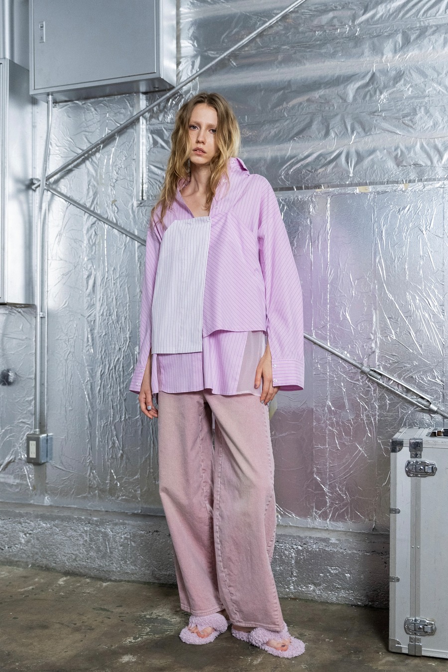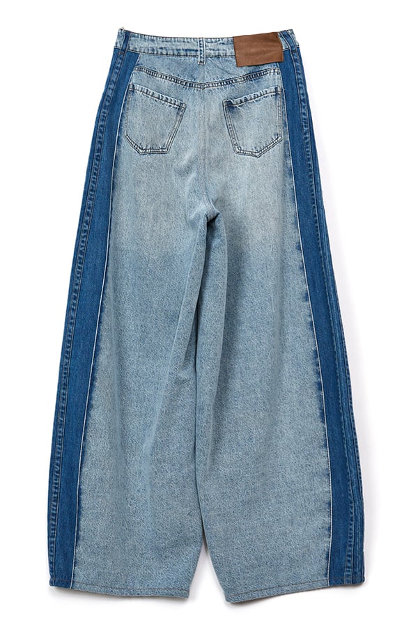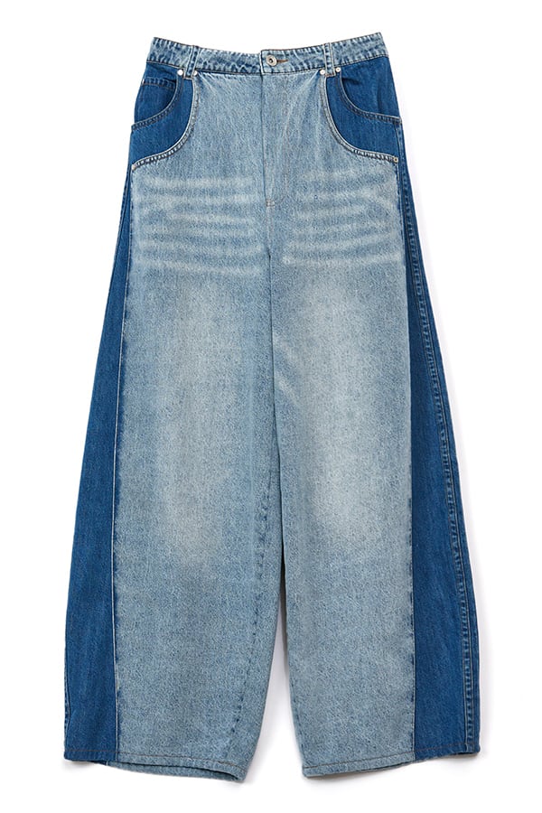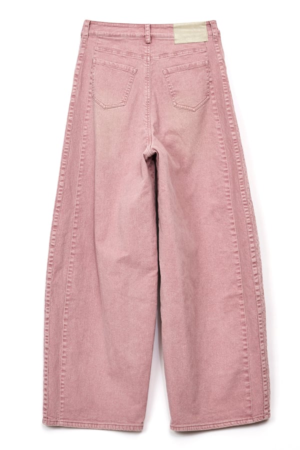 ジャケットと同じ素材のコクーンデニムパンツ。前は2枚仕立てになっておりパンツを貼り付けているようなデザインがポイント。腰回りはすっきりとさせ、裾に向かって丸みを帯びるコクーンシルエット。サイドには共地のラインを施しデザインのアクセントに。カラー展開はシャツジャケット同様、濃淡配色デニムとピンク。さらにボトムはヒゲ、ブラストをしっかりと馴染むように施し立体感のある仕上がりに。※加工物になりますので1点1点風合いや加工感に差が生じます。