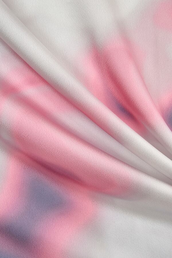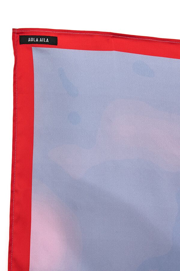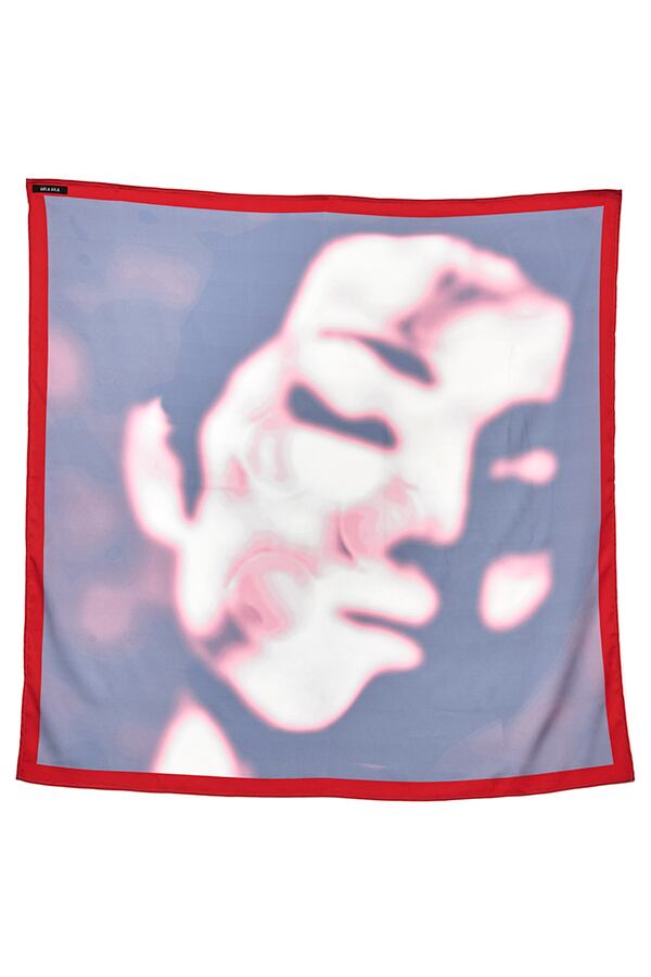 顔プリントの大判サテンスカーフ。女性の顔に光と水をグラフィック化した大きな図案なので、近くで見るとぼかし模様のプリントに見えるが、遠目で見ると大きな顔に見えるおもしろいスカーフ。縁取りと端の三つ折りステッチを配色にしアクセントに。素材はシルク見えする、シボのあるサテンを使用。ラップスカートのように、レイヤードでボトムに巻いたり、三角に追って腰に巻いたり、ベアトップのように身頃に巻いたりと色々プラスワン出来るお勧めアイテム。