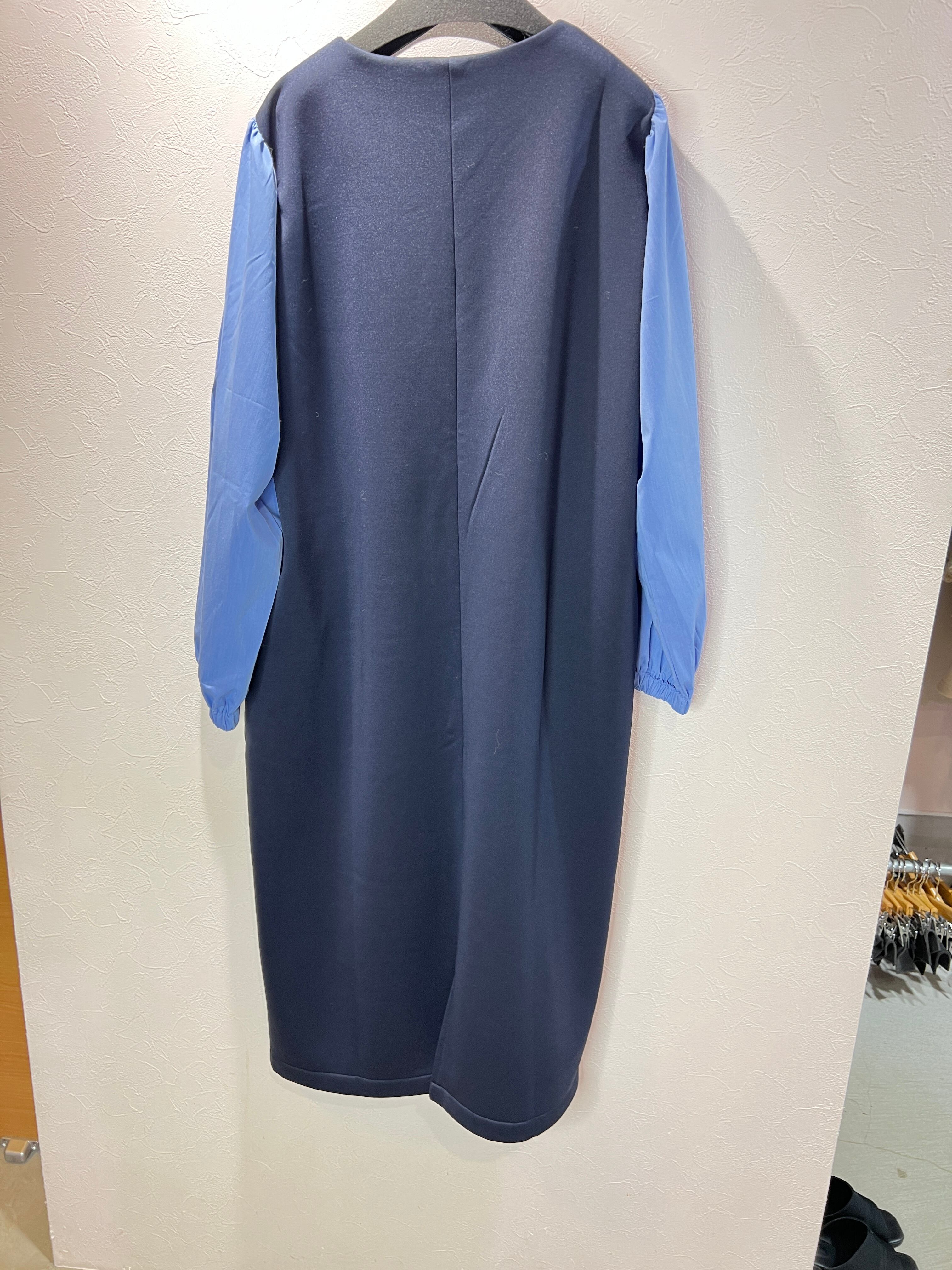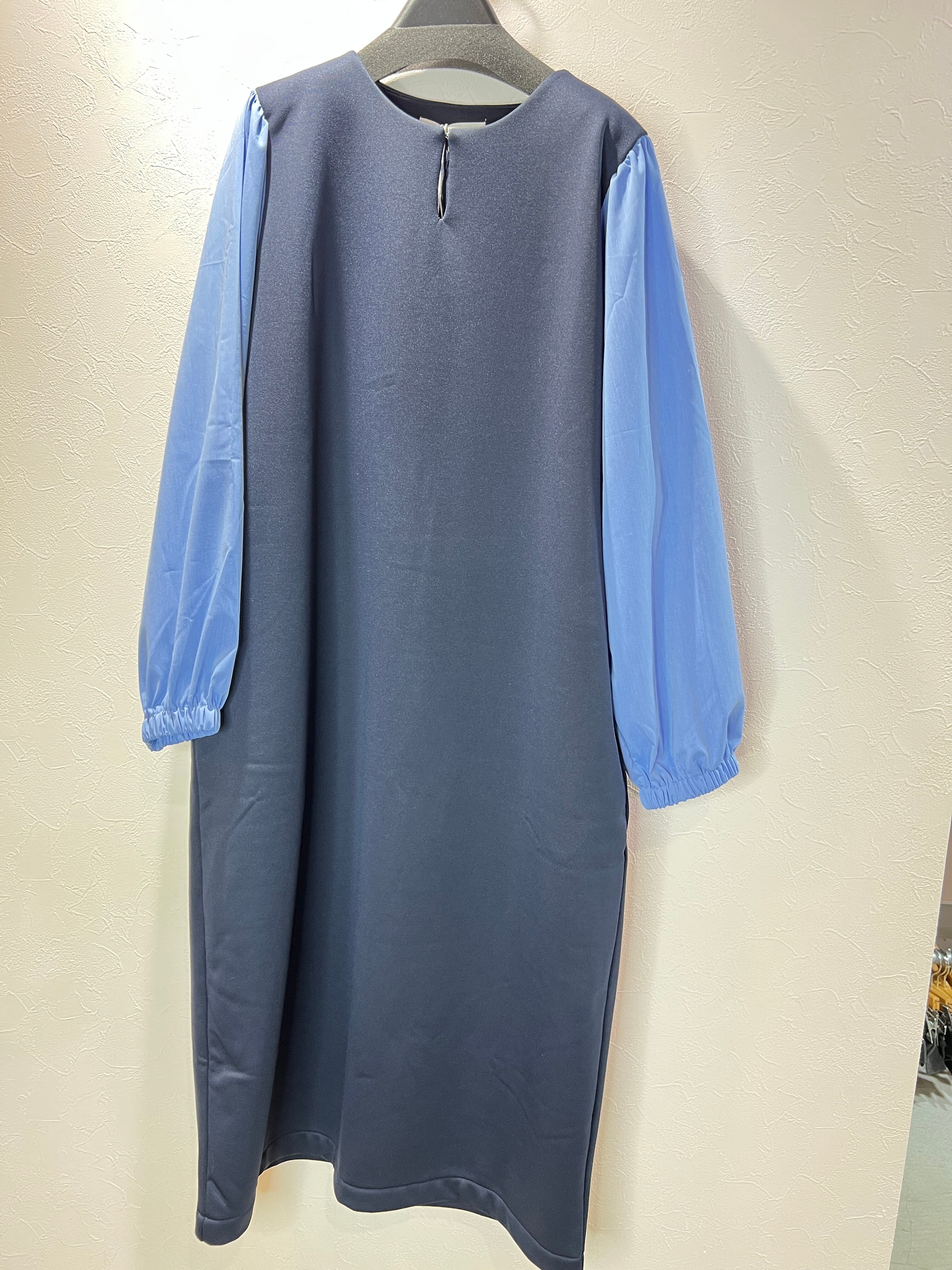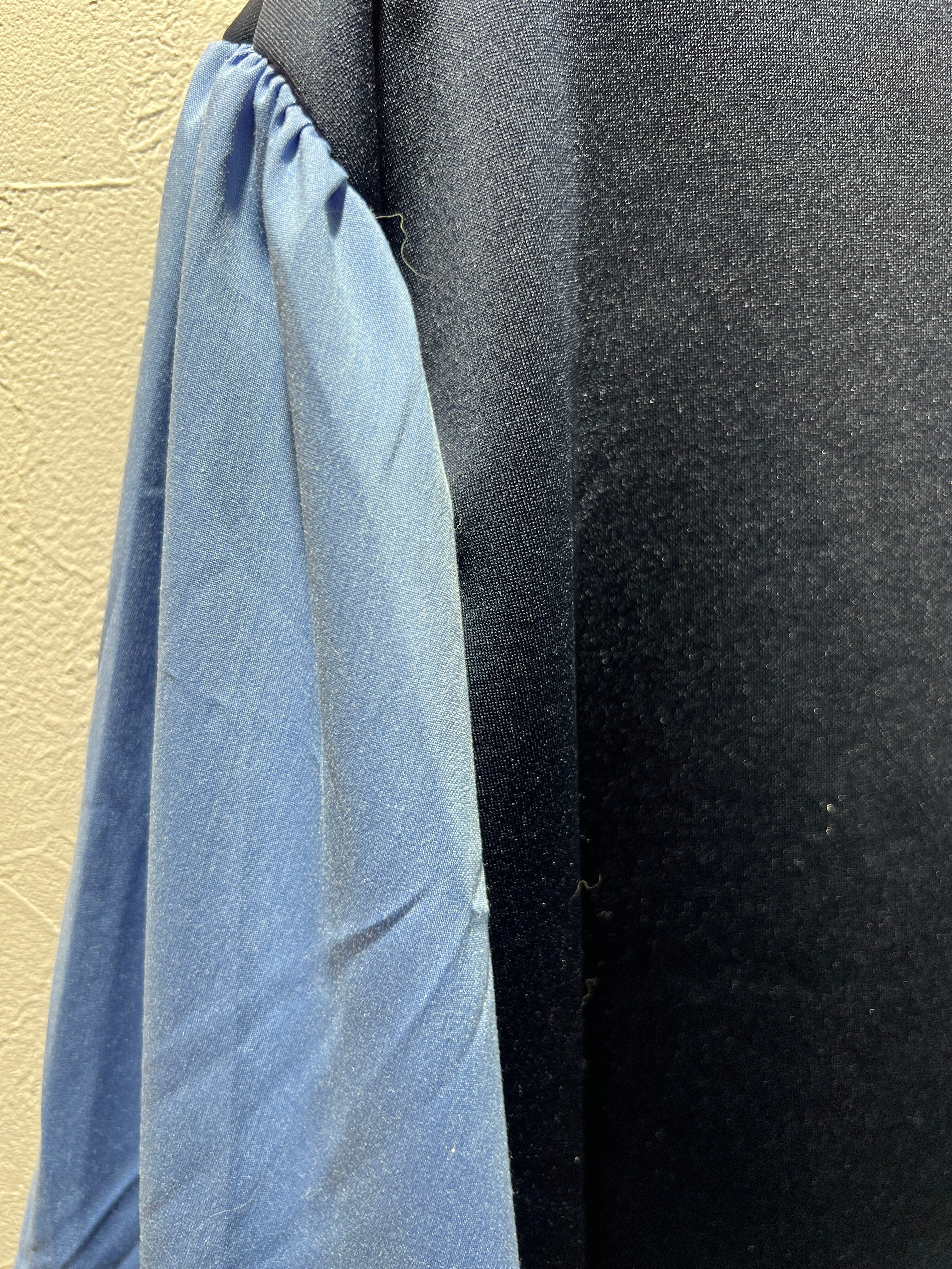 裏起毛のダンボール素材のカットソーをグラウンドにしてポリエステル、レーヨン素材のブラウス素材を袖に使用