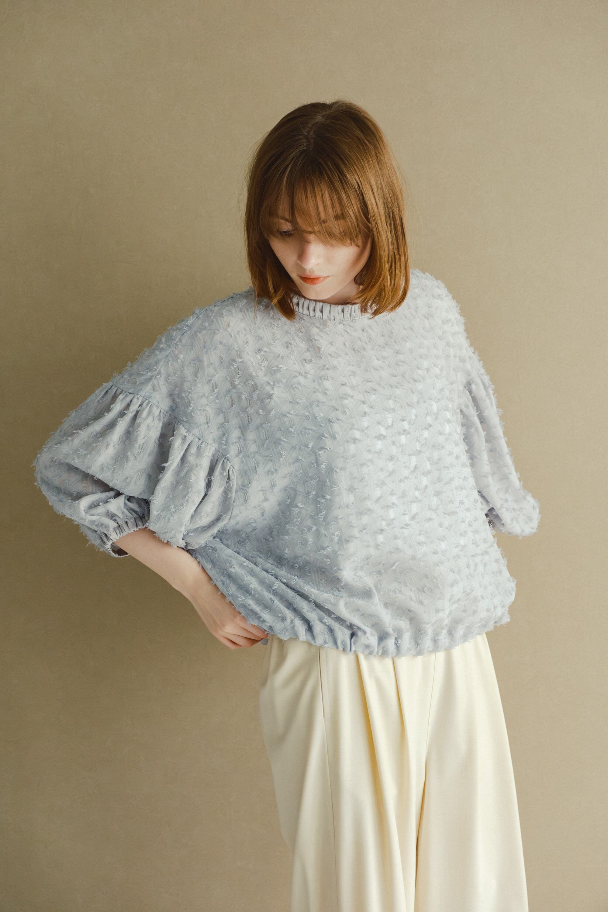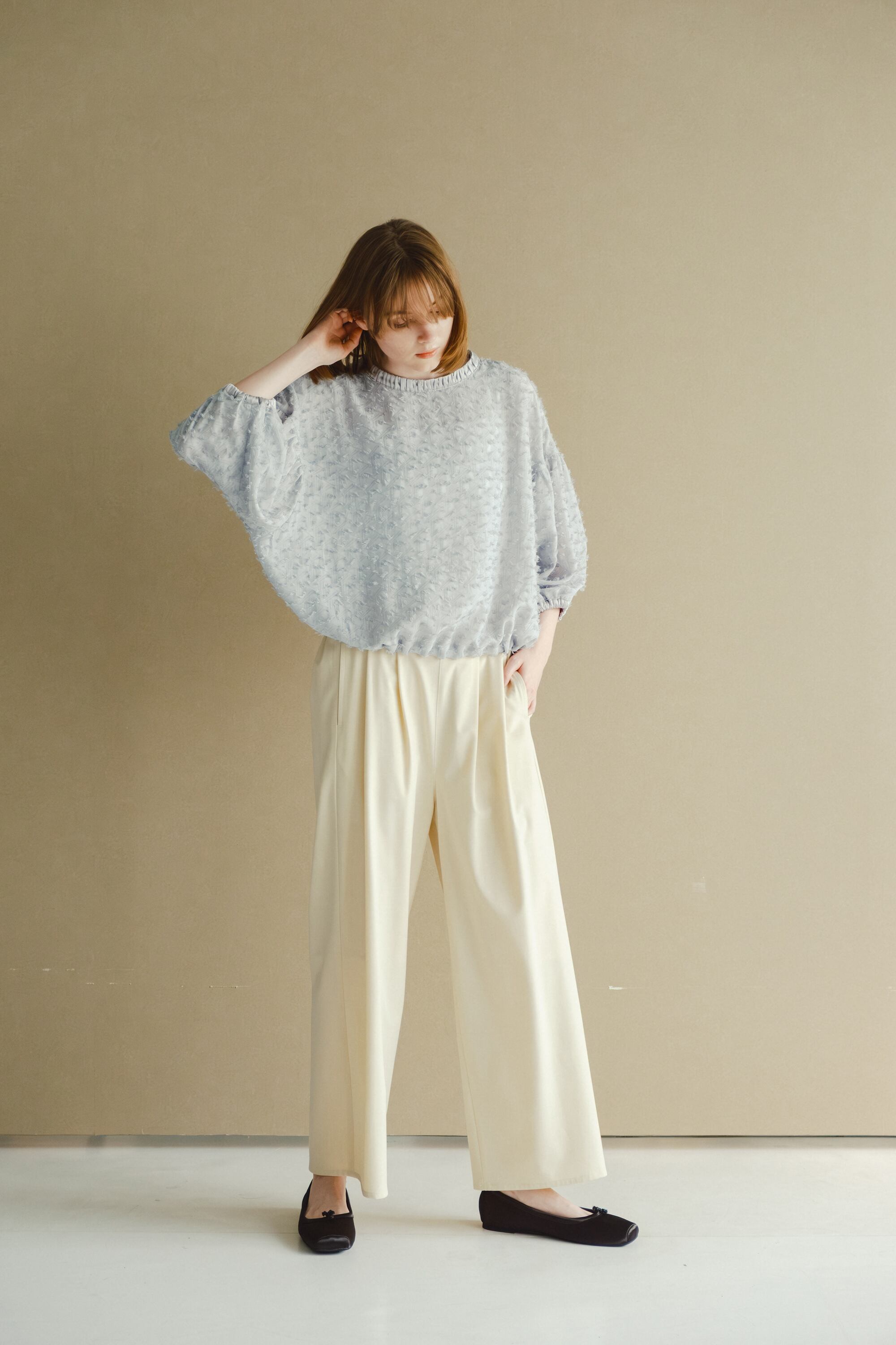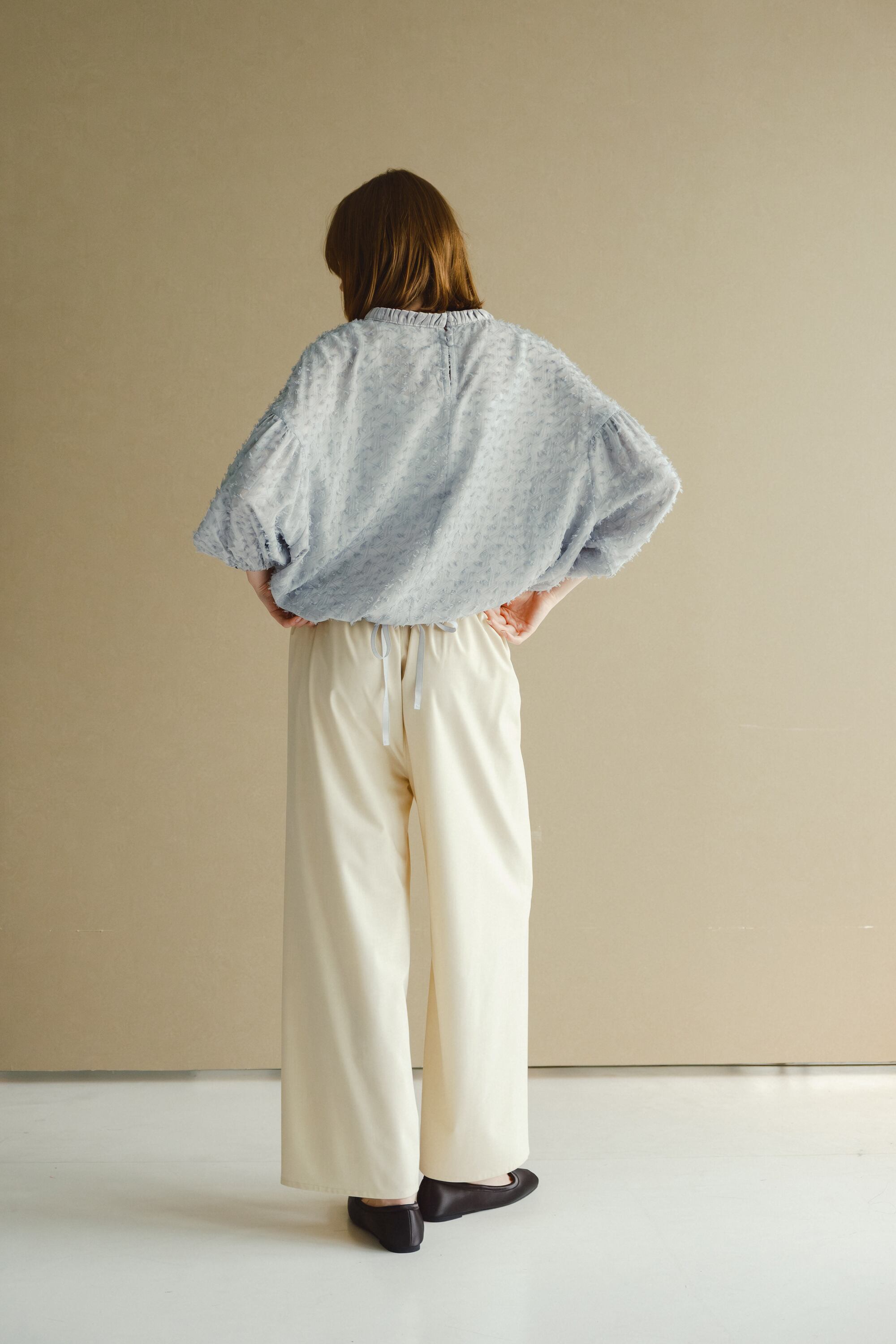 裾にはドローリボン入れており、絞って裾のボリュームを自身で調整していただけます。
