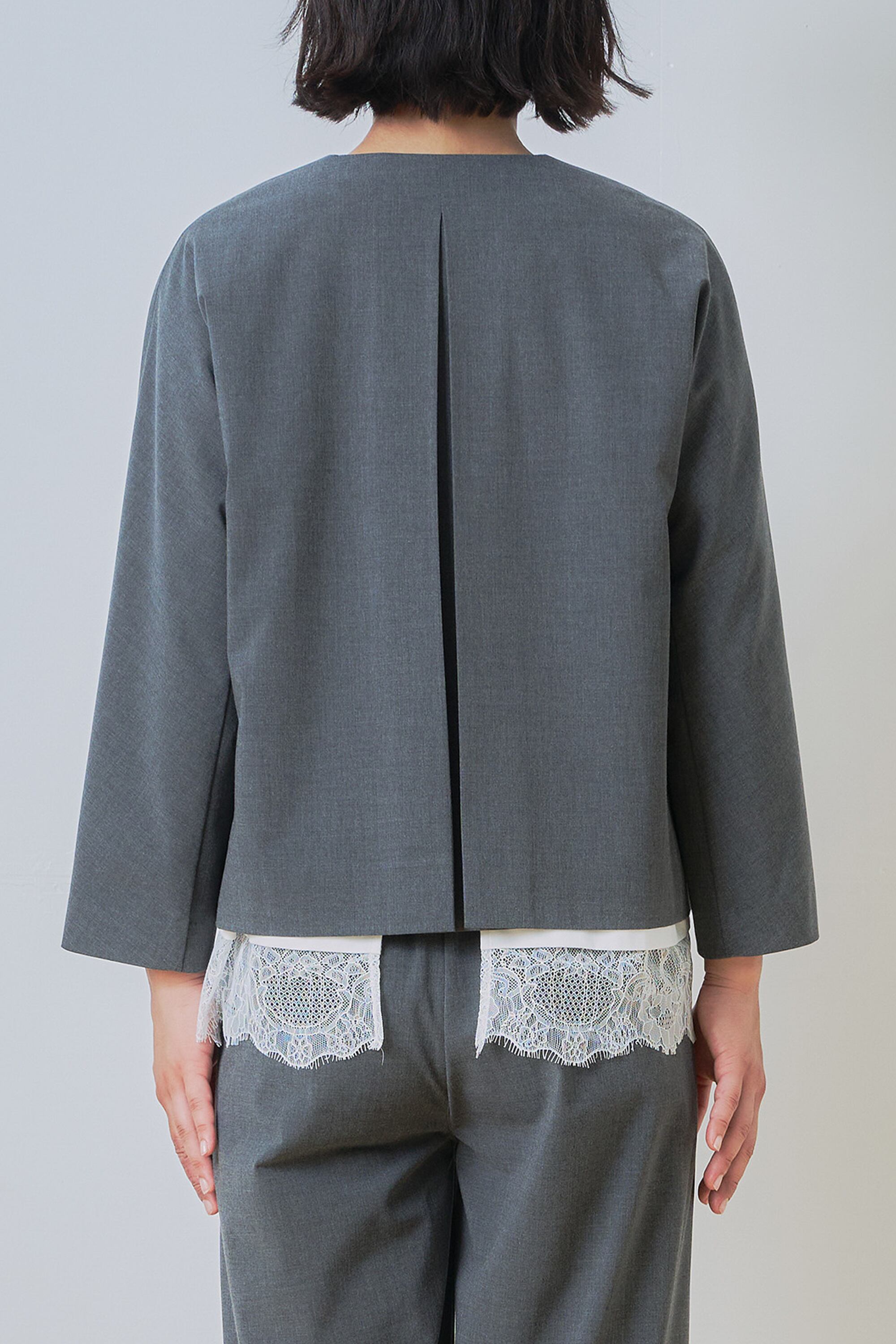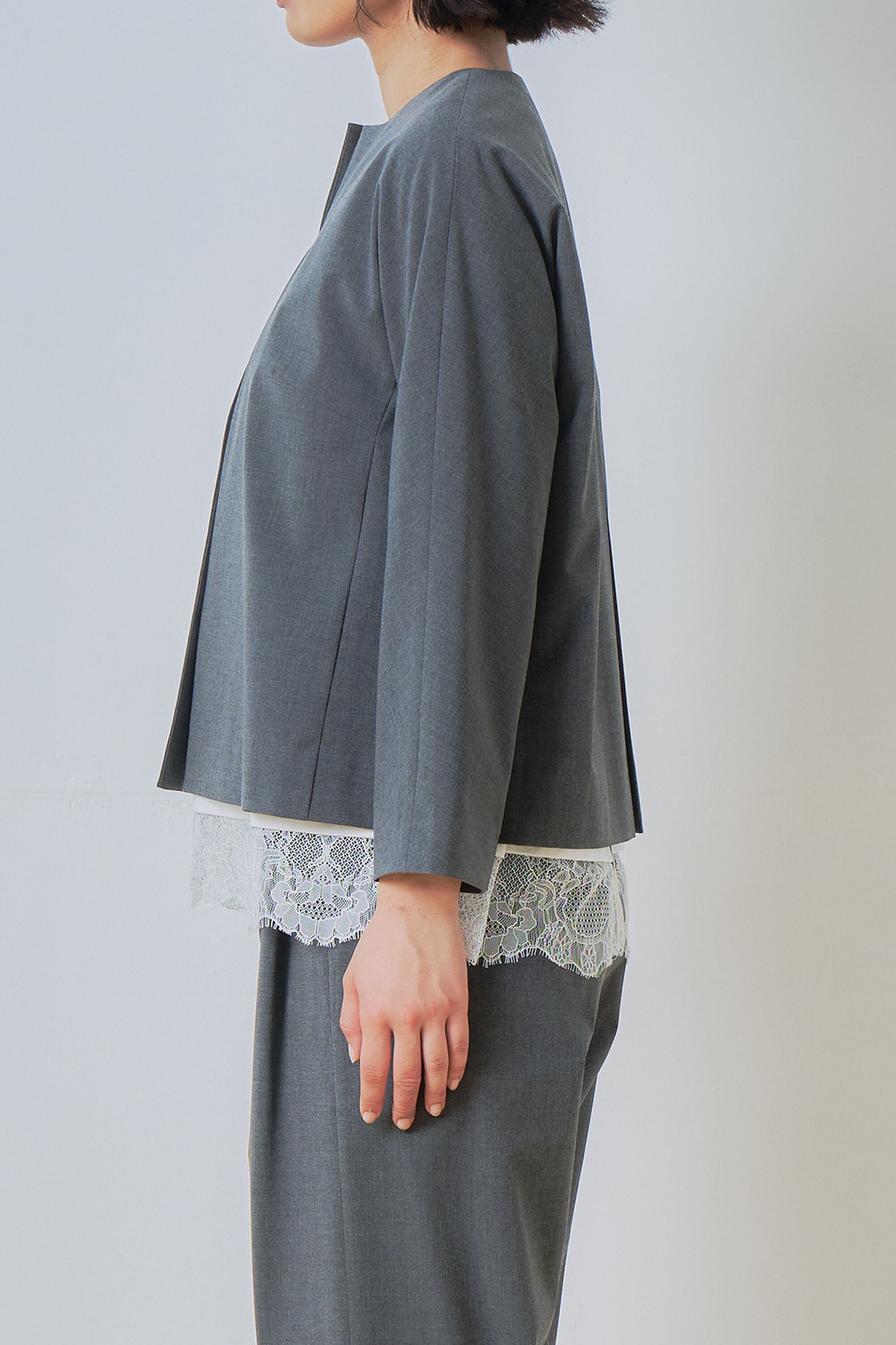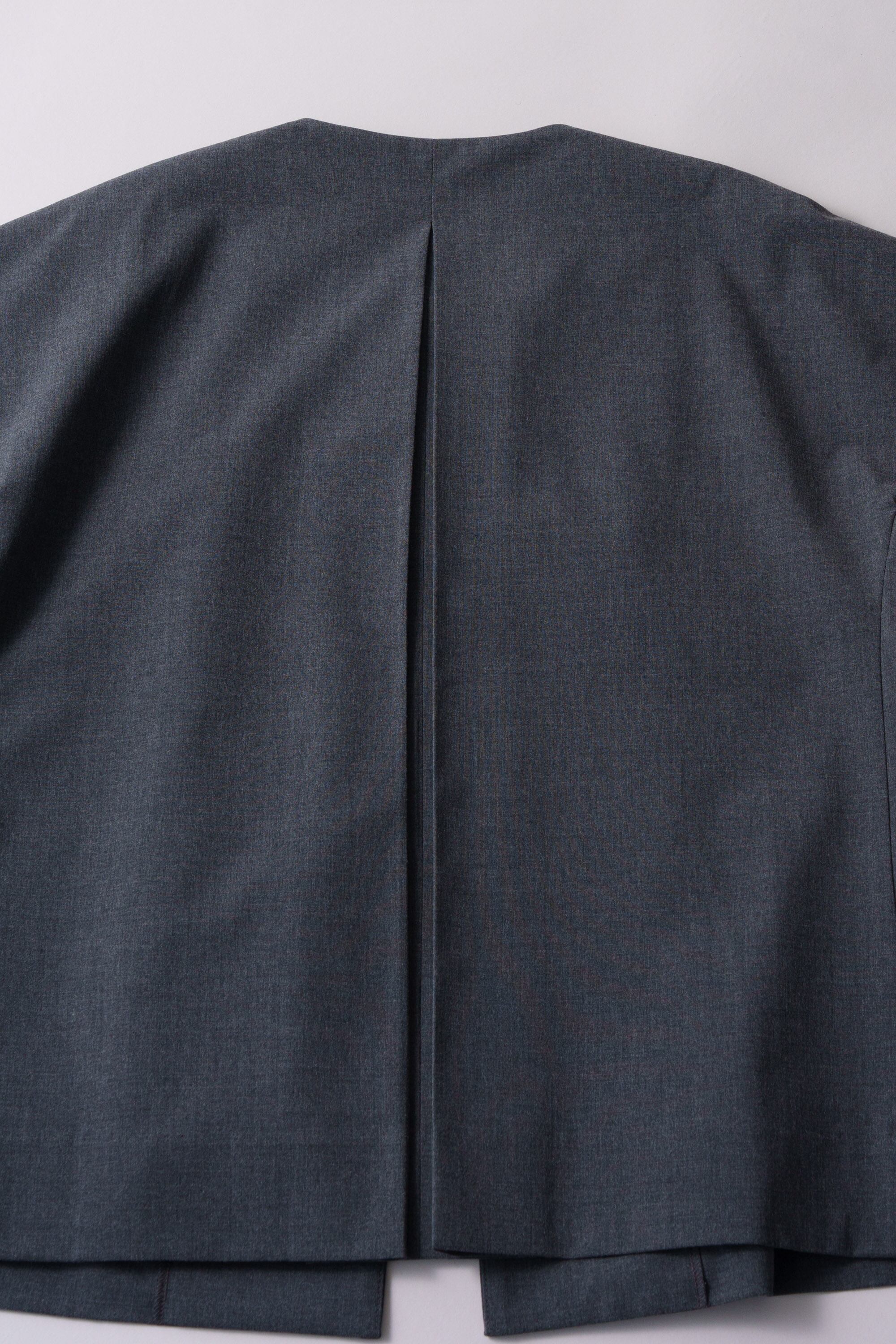 肩から袖にかけて、切り替えなしで作る事で、肩の丸みに沿いながらスッキリと見せてくれるラインに仕上げました。