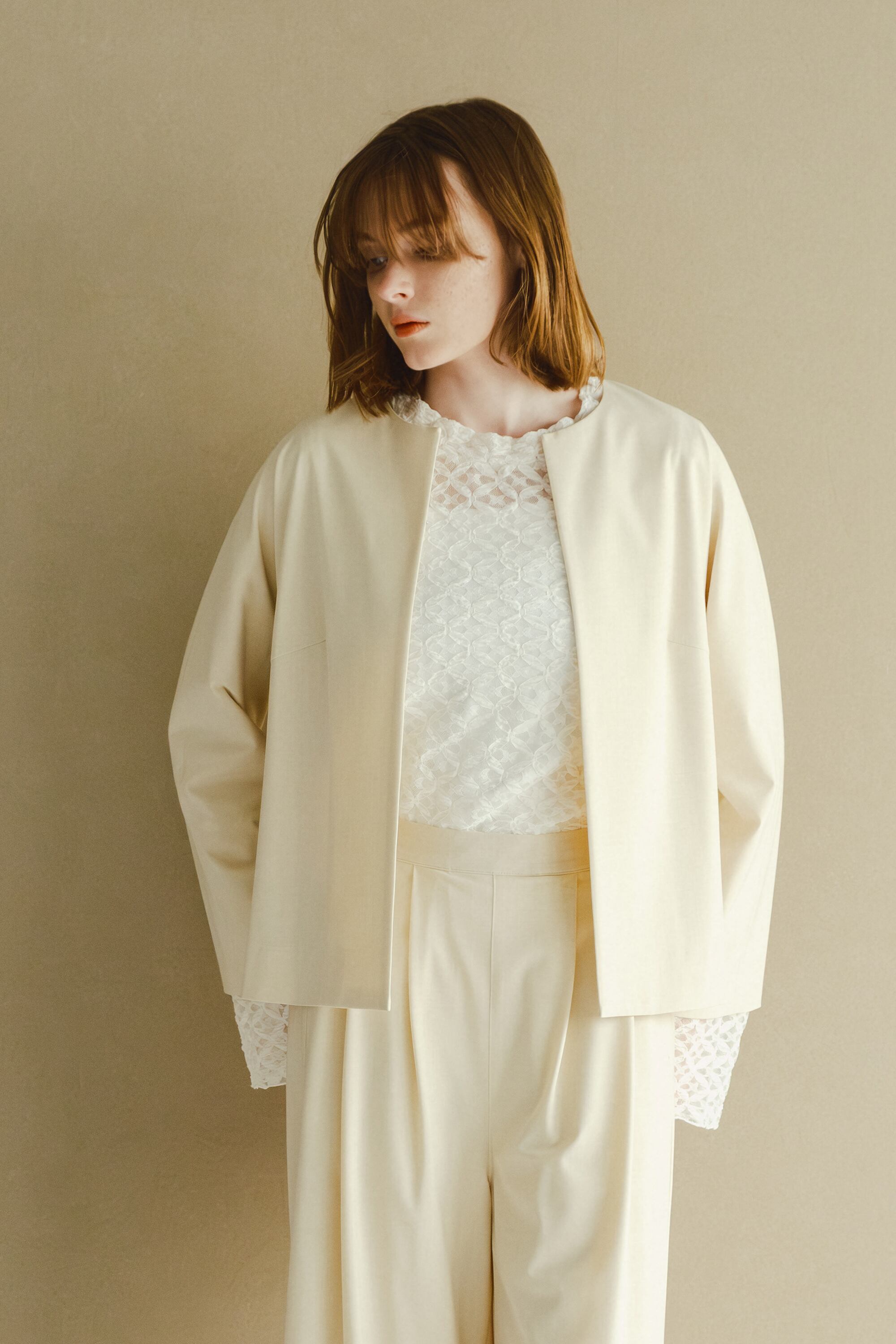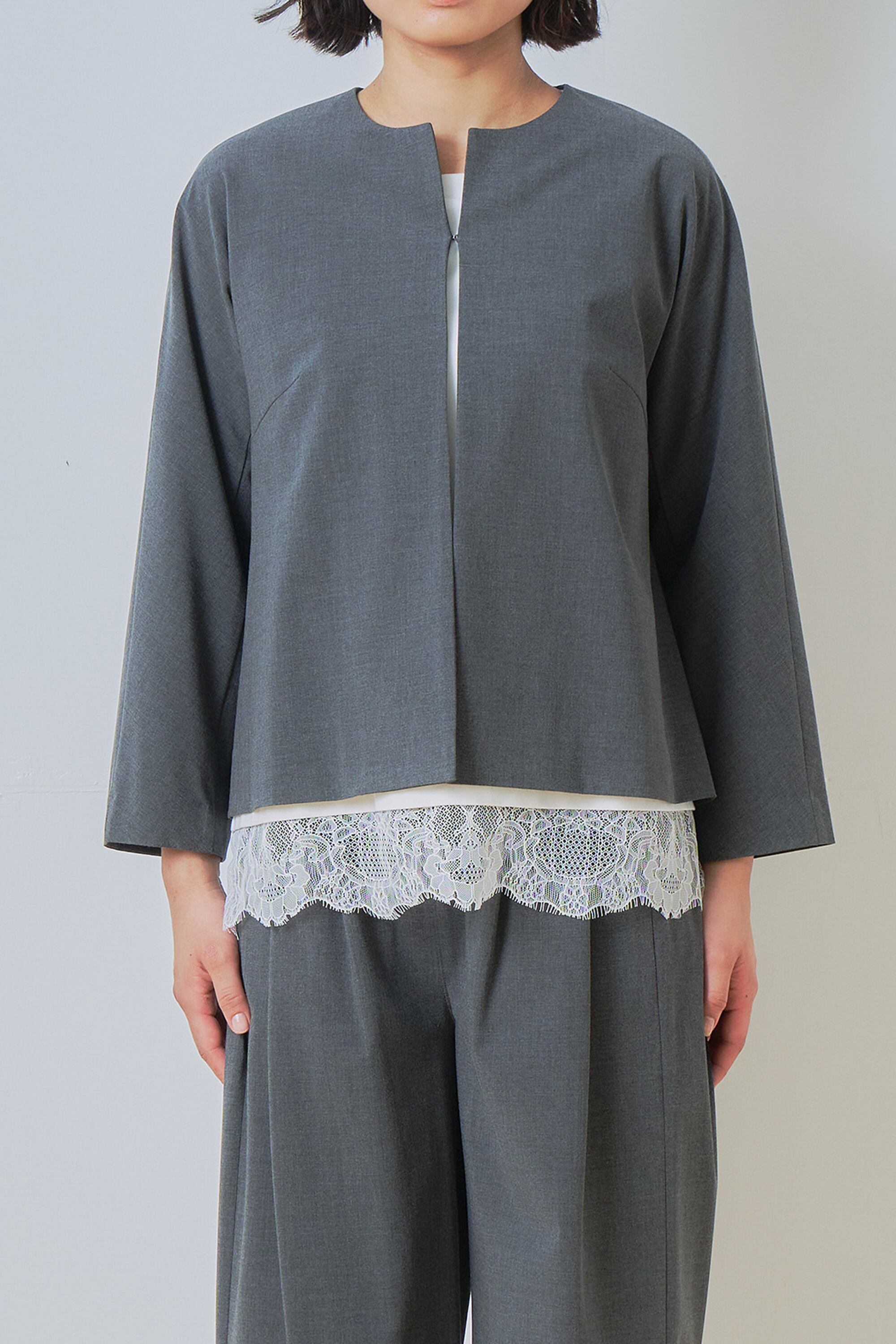サマーウールライクな細い番手で編みあげ軽く仕上げたノーカラージャケットです。