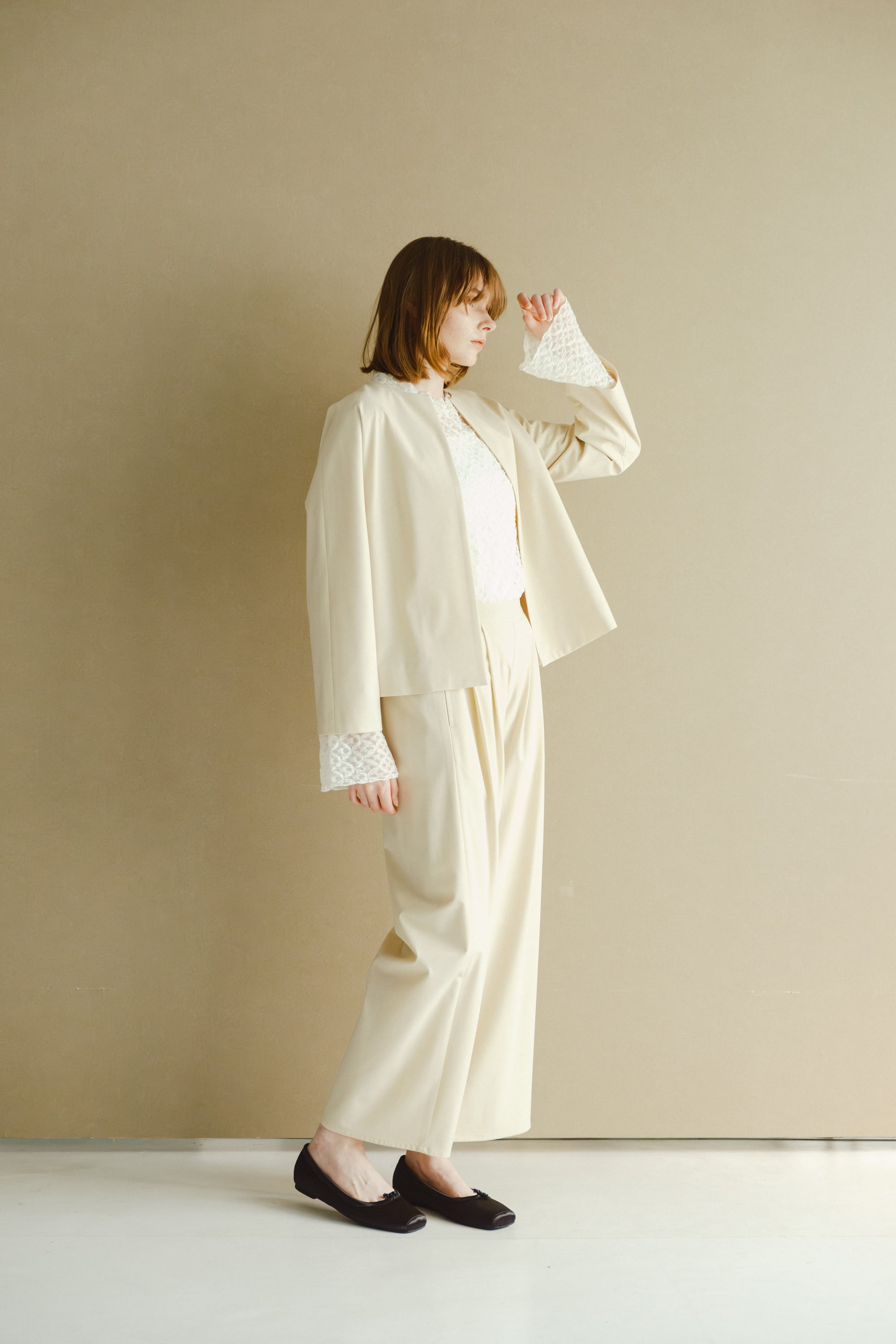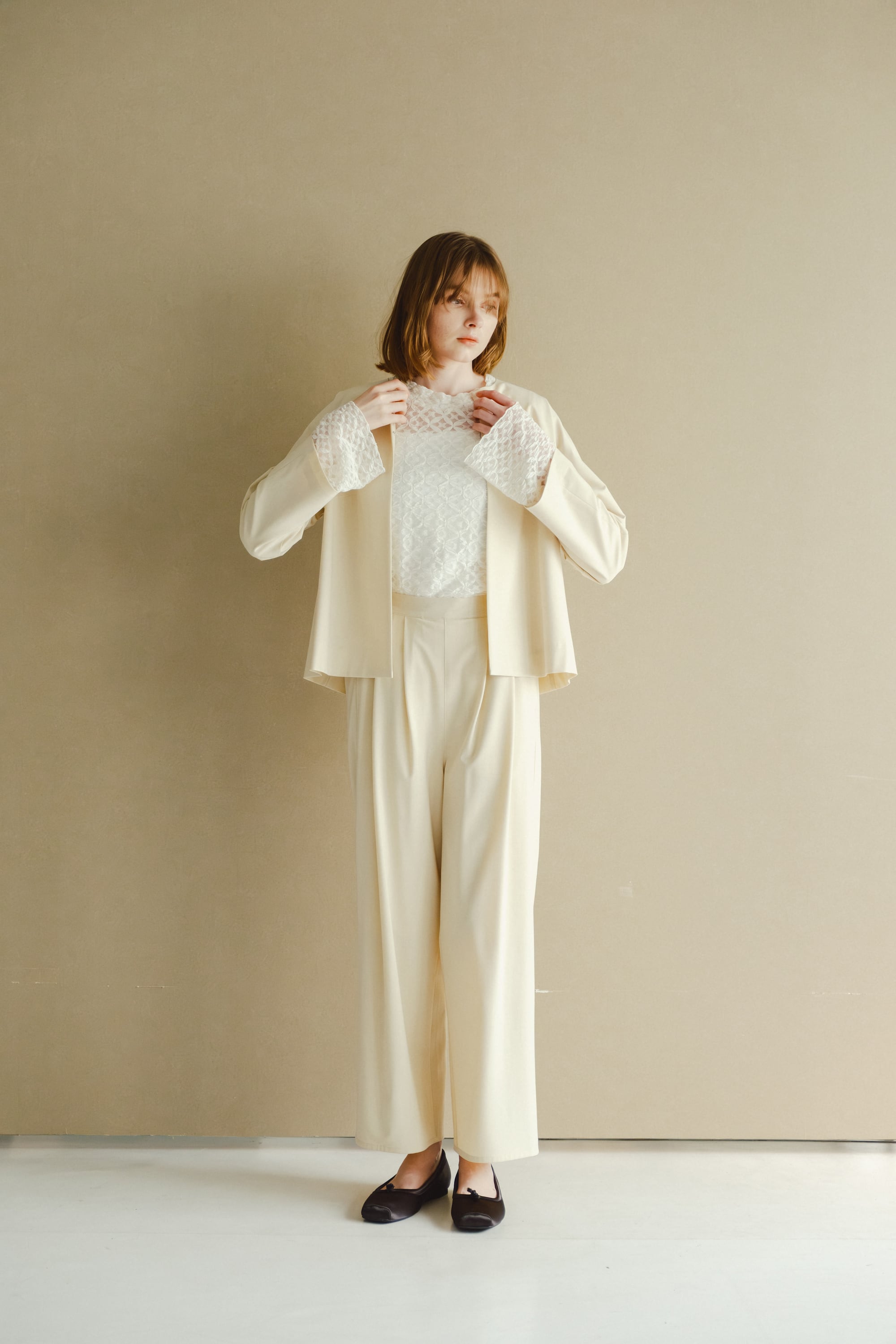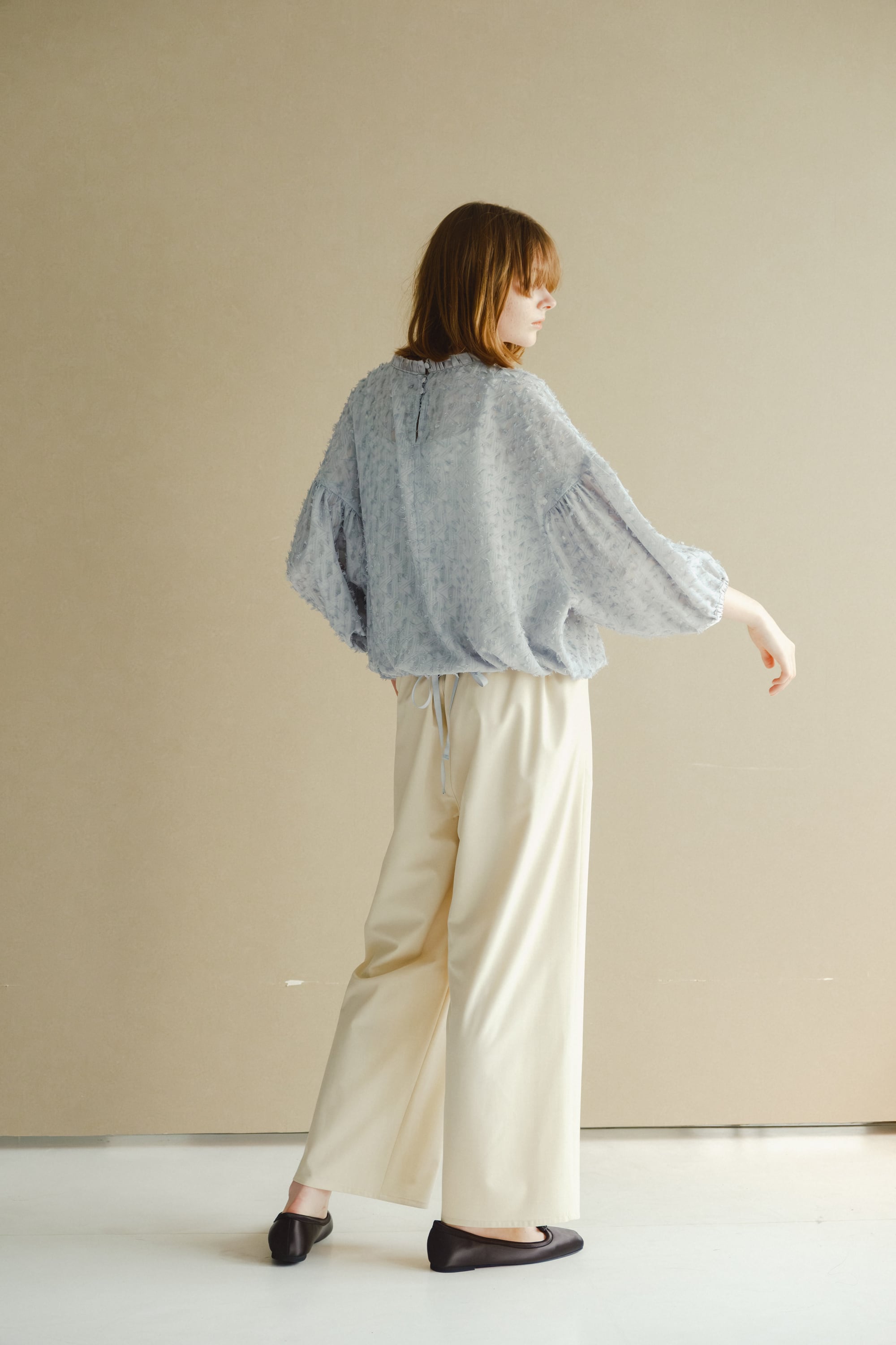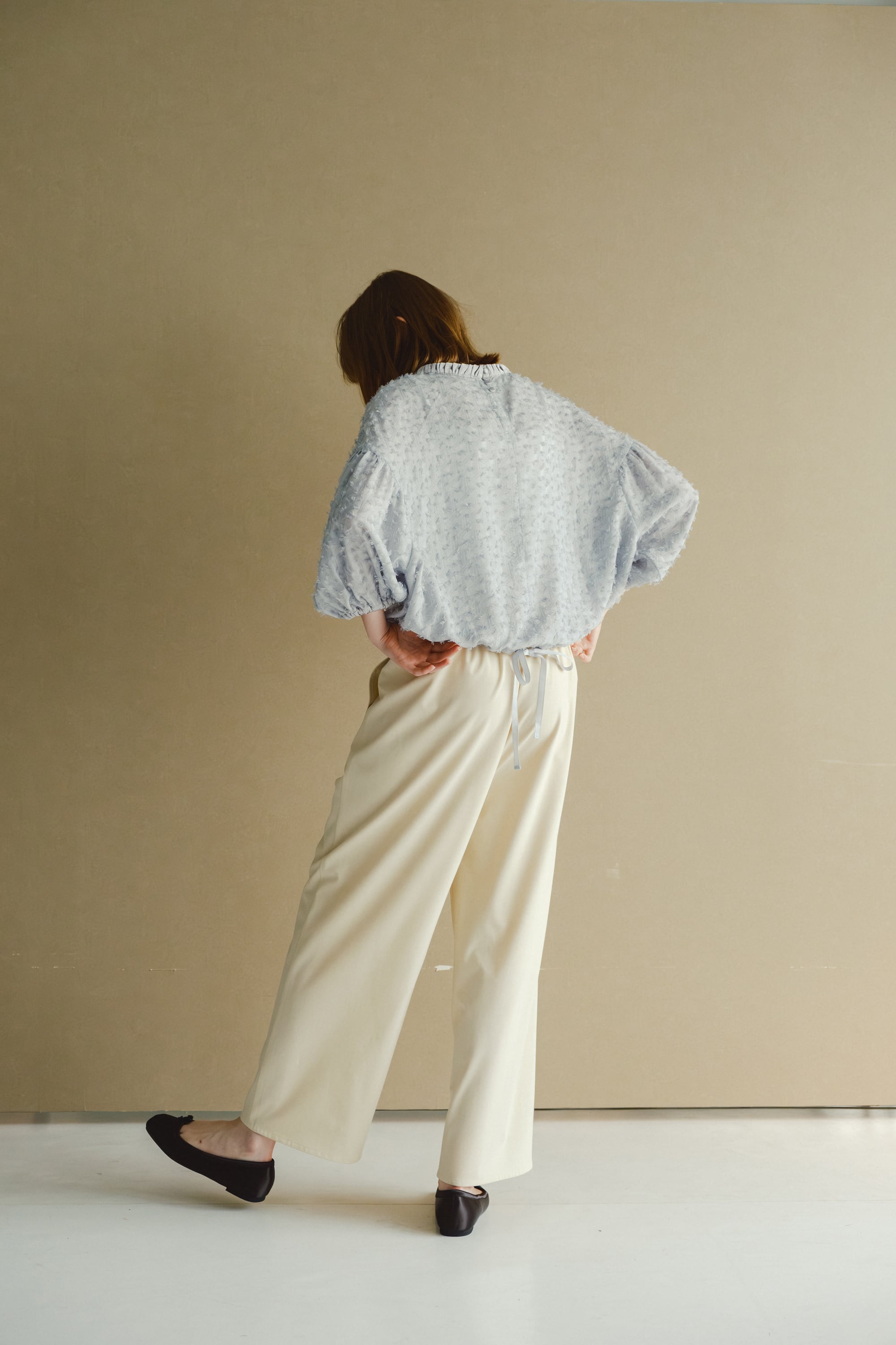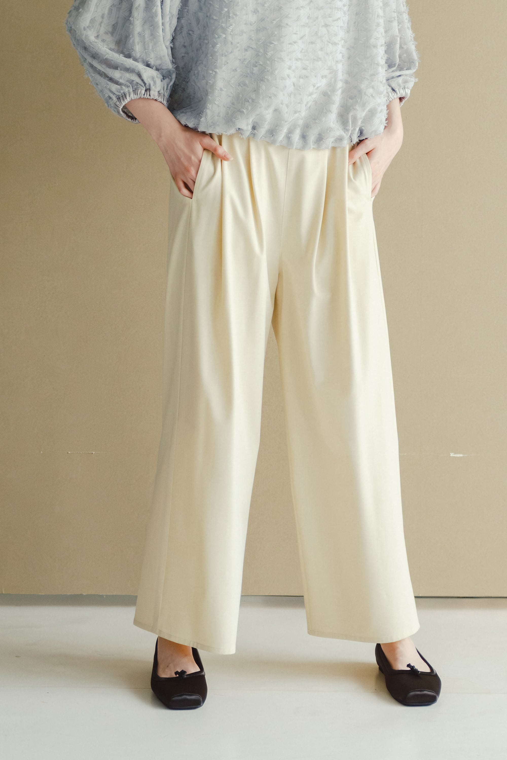 サマーウールライクな細い番手で編みあげ軽く仕上げたワイドパンツです。