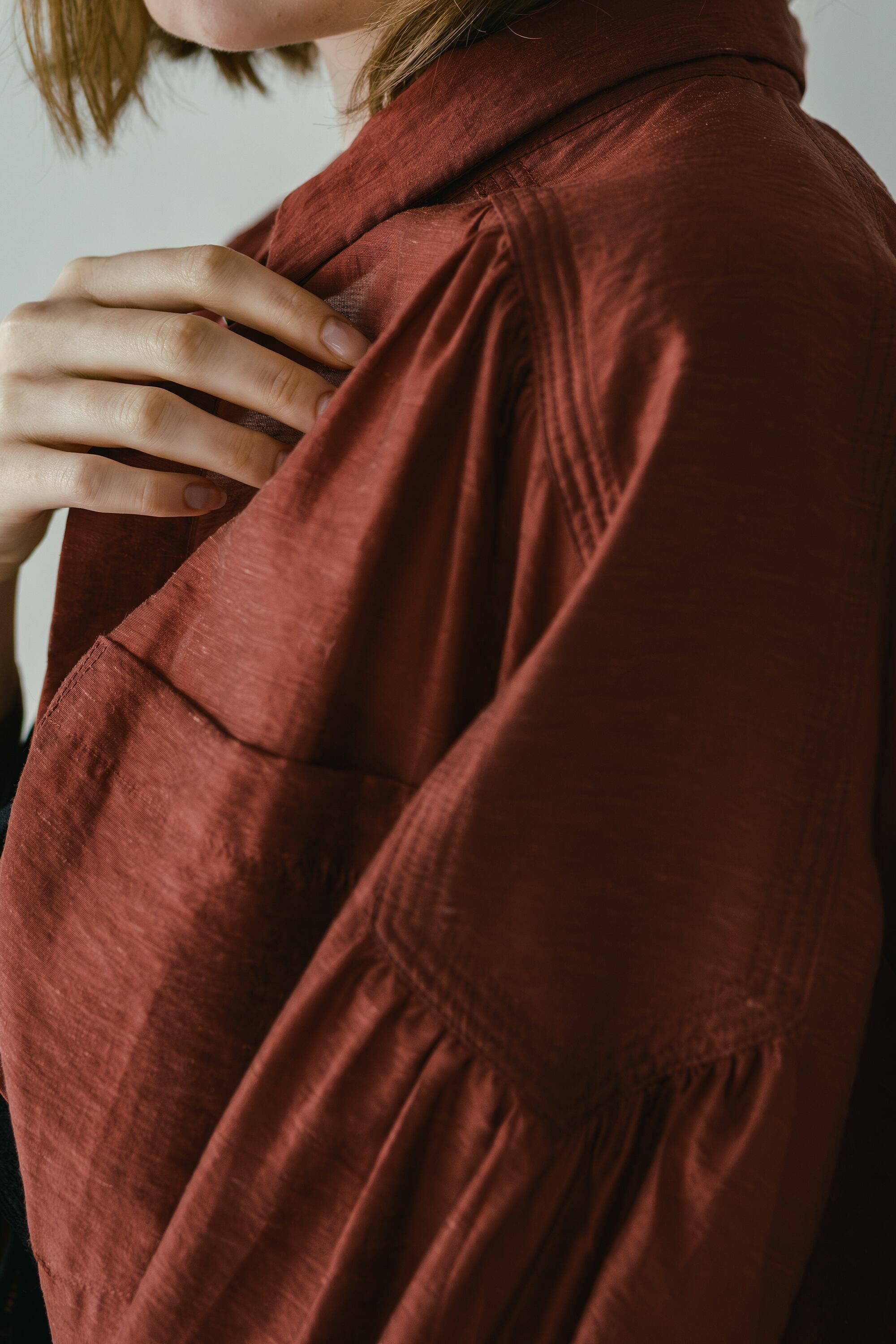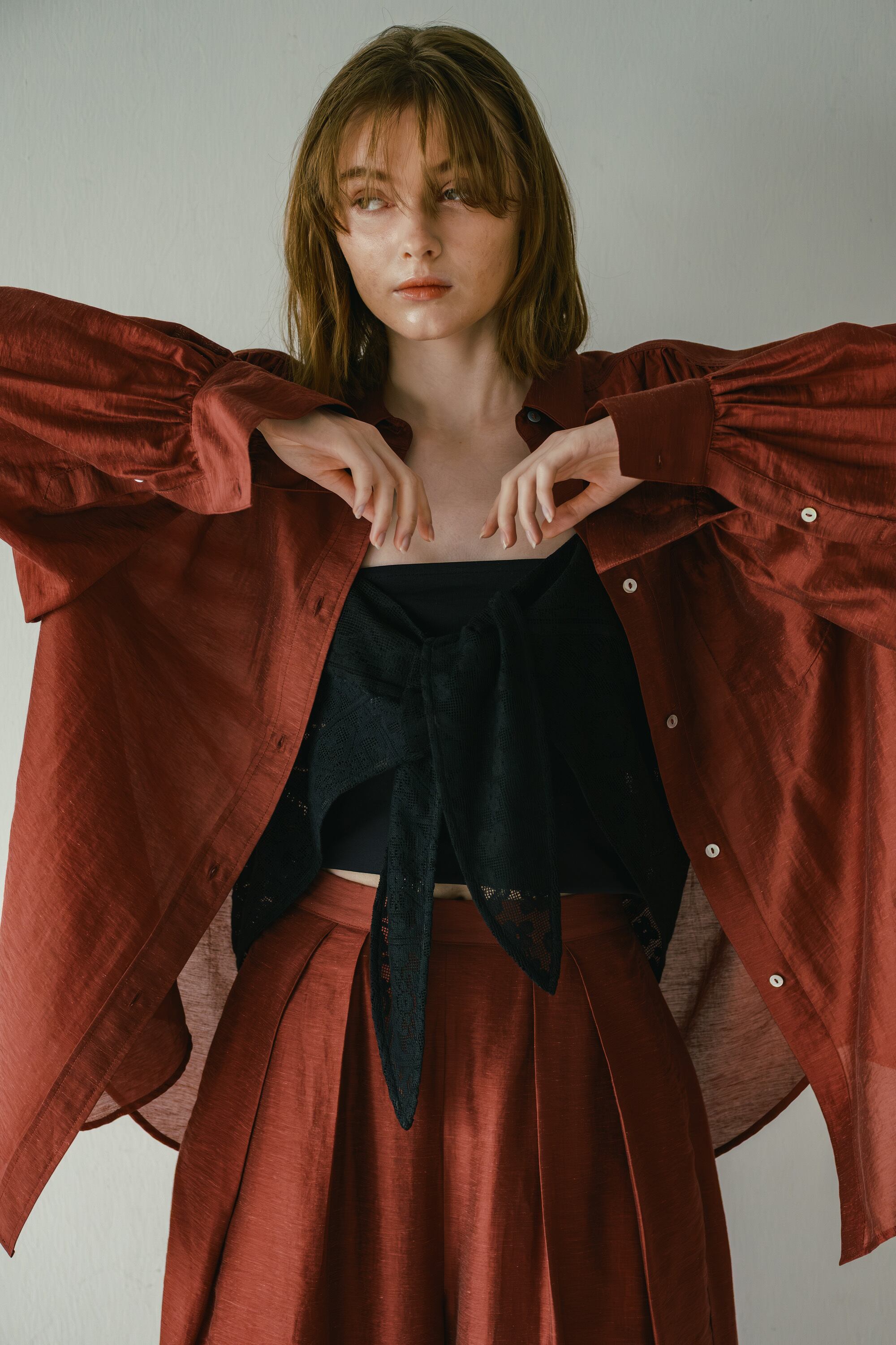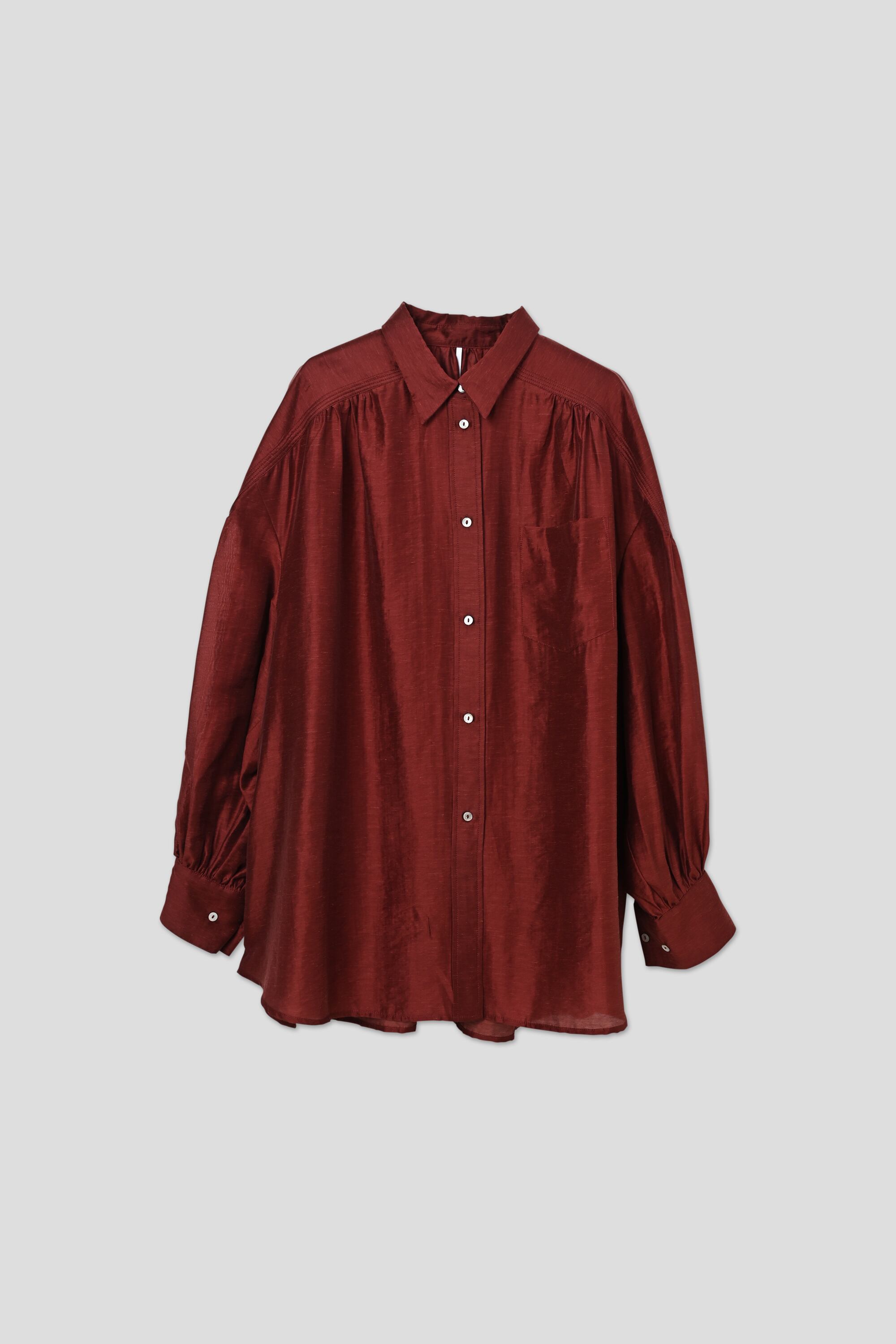 ・肩のデザインヨークから、タックギャザーでたっぷりとボリュームを持たせた袖が特徴的。
